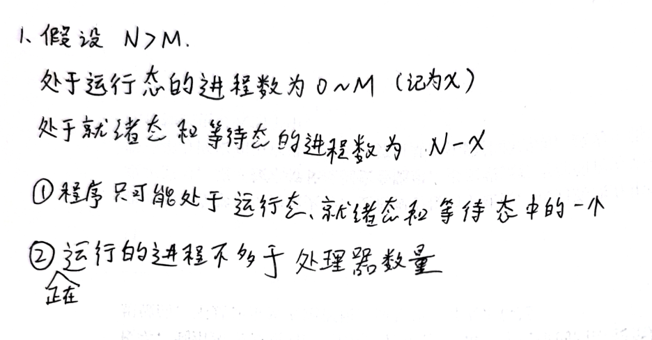 M个处理器,N个进程,处于运行态的进程个数可以是多少?处于就绪态和等待态的进程可以是多少?为什么?