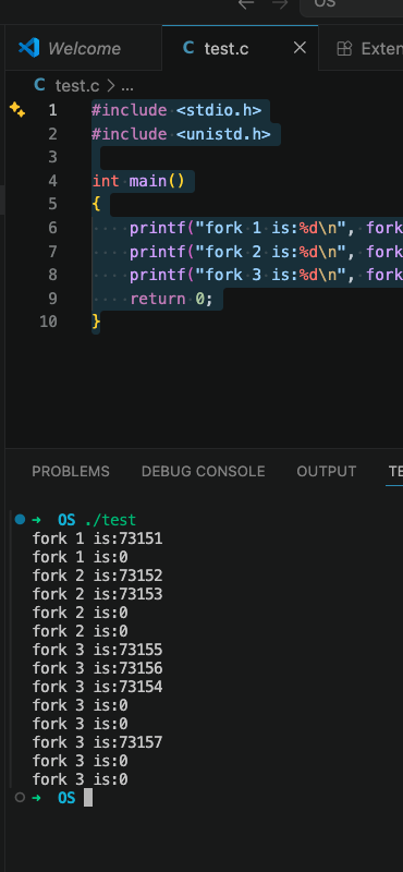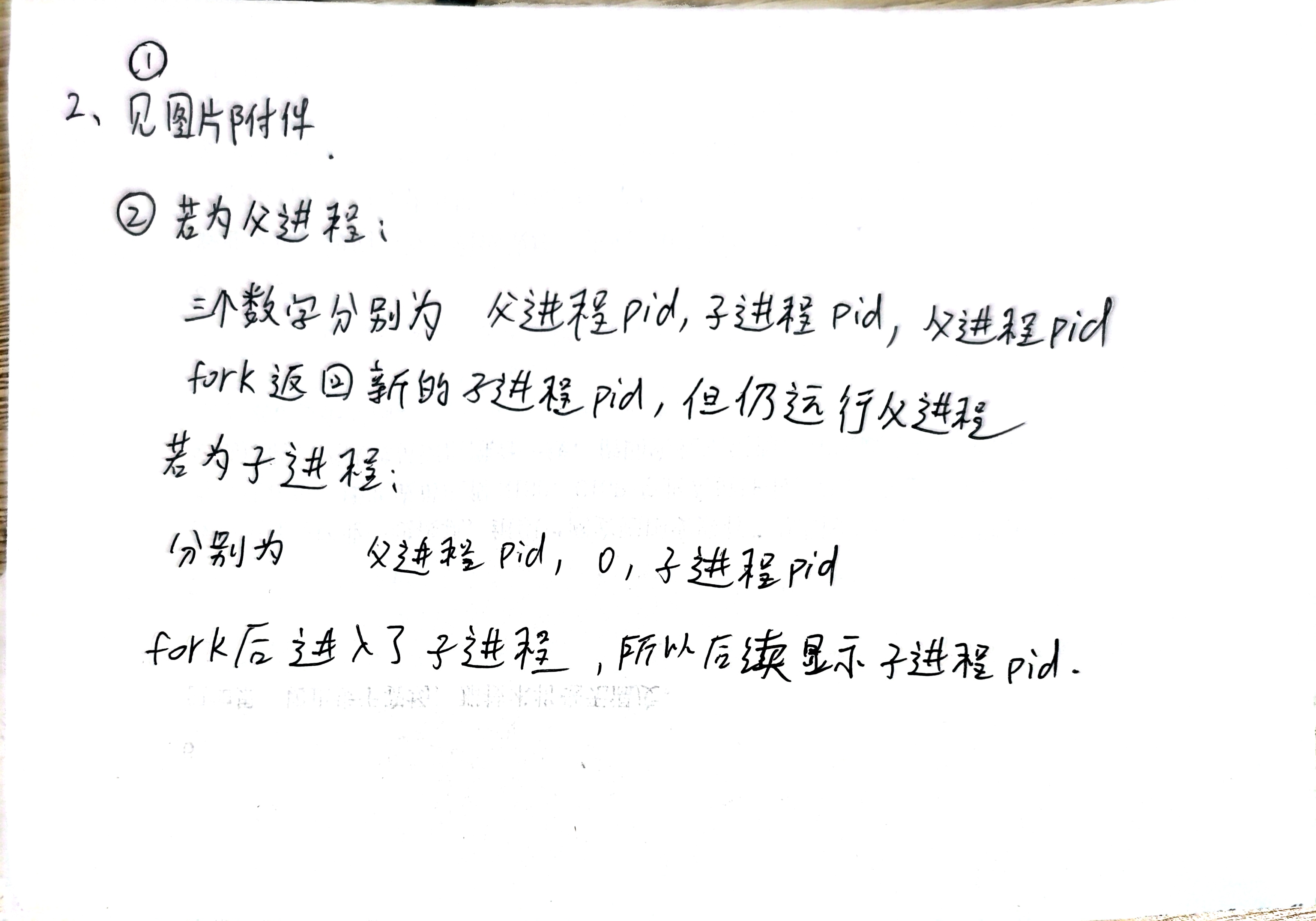 ② 对于练习中的三行打印,如果把打印改成“%d,%d,%d\n”,getpid(),fork(),getpid()函数,结果会怎样?为什么?